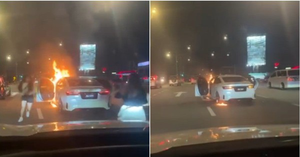 Từ hình ảnh được ghi lại ở hiện trường, có thể thấy một chiếc sedan hiệu Vios đang dừng giữa đường, bật đèn cảnh báo sau khi bốc cháy. Tài xế của Vios và 3 người trên xe hoảng loạn tháo chạy khỏi chiếc xe khi mui xe bắt đầu bốc lửa.