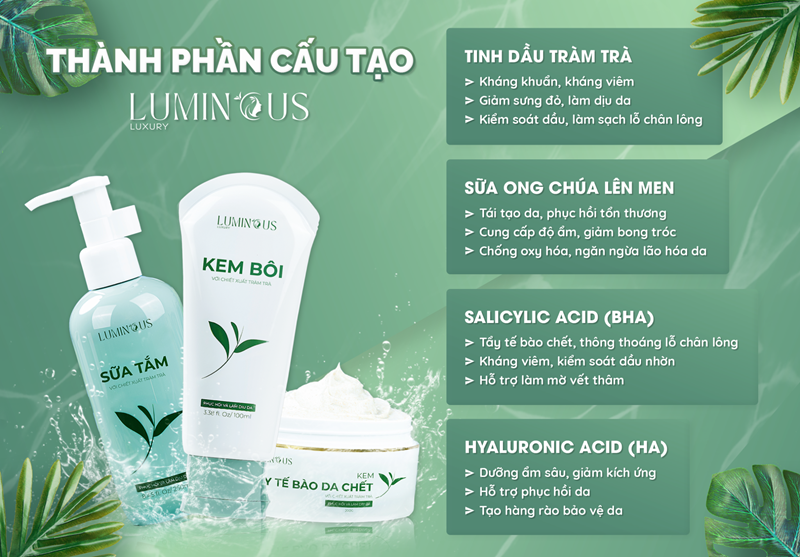 Bộ sản phẩm chăm sóc da body LUMINOUS “được nghiên cứu bởi các chuyên gia hàng đầu”. Trong đó, dòng sản phẩm sữa tắm Luminous với công dụng làm sạch bụi bẩn, vi khuẩn, cấp ẩm dưỡng trắng da, giúp da mềm mịn thông thoáng hơn. Tẩy da chết LUMINOUS loại bỏ lớp sừng trên bề mặt giảm bít tắc lỗ chân lông, làm mềm da. Kem bôi LUMINOUS có thành phần tràm trà kết hợp với 24 loại vitamin giúp kháng viêm thúc đẩy giảm mẩn đỏ ngứa mụn, dày sừng , cấp ẩm, dưỡng trắng cho da từ đó hỗ trợ phục hồi da hư tổn, nhất là phục hồi thâm sạm da sau sau viêm nang. Bộ 3 sản phẩm là sự kết hợp hoàn hảo cho da body căng sáng mịn màng.